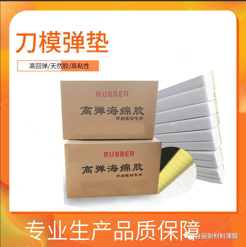 1) 用高弹性介质背面涂布自粘胶制成,用于模切件的回弹脱模,回弹力强、硬度适中、能够减少刀具上的压力,粘贴方便,经久耐用,是刀版模切的辅助用品,使用方便,可随意裁剪。